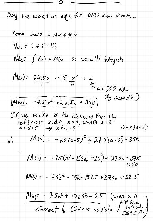 For the last part of the lecture where we define a function for bending moment, I thought I would try an integration approach where I start with x being from the point D. Turns out this approach works too. Honestly though, Dr. Sean Carrolβs approach might be a bit simpler since there is less algebraic manipulation. Anyways, it can be done!